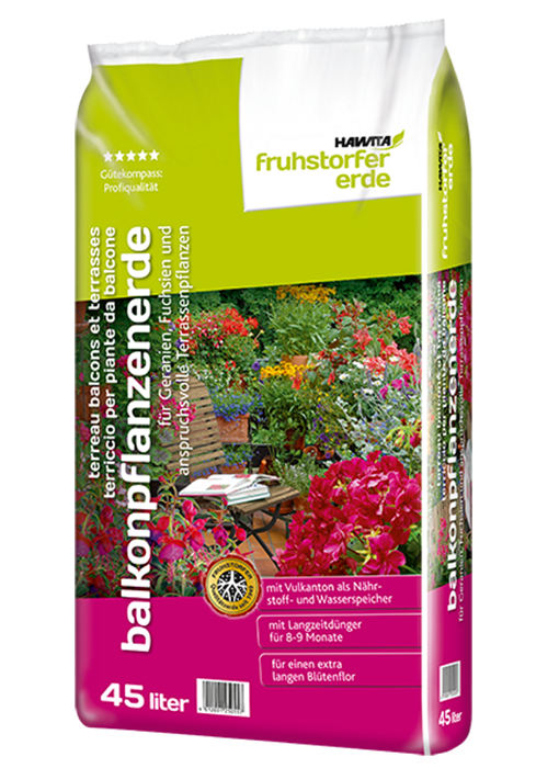 Die Hawita-Fruhstorfer Balkonpflanzenerde ist ein bewährtes, gebrauchs- fertiges Kultursubstrat für Geranien, Fuchsien und andere Balkonpflanzen. Nähr- stoffgehalt und pH-Wert der Erde sind speziell auf die Anforderungen dieser Kulturen abgestimmt. Die zugeführten Nährstoffe werden durch den hohen Anteil an sorptionsstarkem Vulkanton abgepuffert und der Pflanze nach Bedarf zur Verfügung gestellt. Besonders in der Sommerzeit beugt der ausgeglichene Wasserhaushalt einem Austrocknen vor. Das Substrat ist strukturstabil und begünstigt das Porenvolumen. Die Wurzelbildung, das Wachstum und die Blüh- willigkeit werden dadurch gefördert.